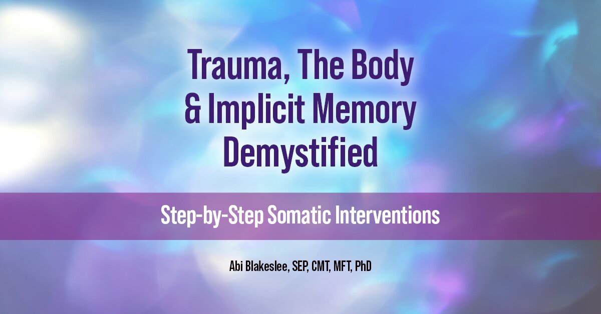 Dr. Abi Blakeslee world renowned trainer in trauma recovery and the founder of Implicit Psychotherapy. She is senior faculty at Somatic Experiencing International. Dr. Blakeslee holds a PhD in clinical and somatic psychology and an MA in counseling and depth psychology. Dr. Blakeslee integrates the study of implicit memory and psychophysiology in clinical research, primary and secondary trauma interventions, neuro-consulting, and the psychobiological principles of attachment and shock trauma.